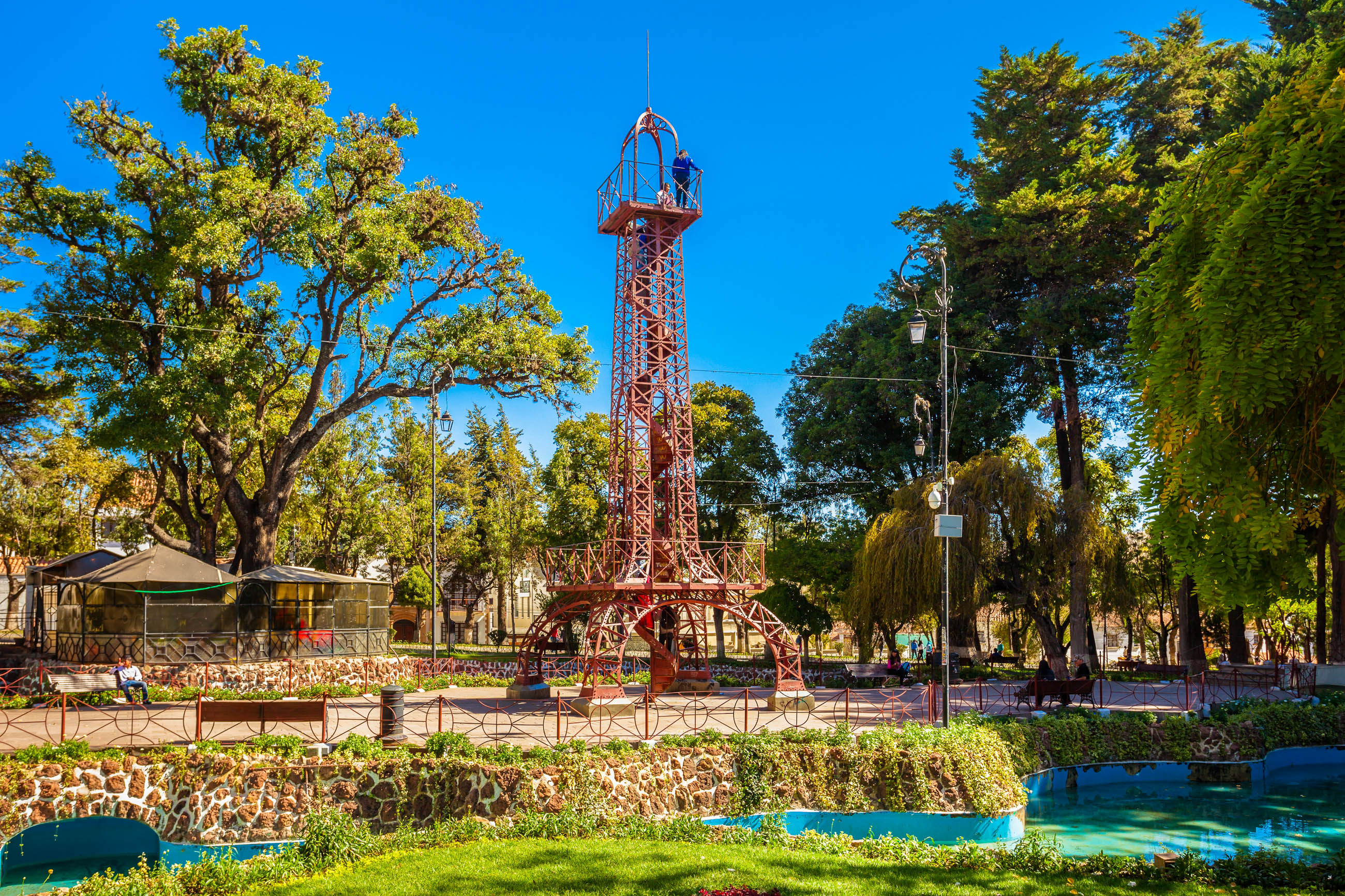 Previously known as the Alameda promenade or the Prado, it was commissioned by the last president of the Royal Audience of Charcas and was later modified in the mid-18th century. In 1925, two triumphal arches with an obelisk in the center were added, forming monuments that now clearly represent French influence. The fountain is called the Fountain of Venus or the Muses, and at its center, there is a scale replica of the Eiffel Tower in Paris, which originally functioned as a meteorological observatory for the Sucre Medical Institute; it currently forms part of the promenade and attractions of the park. A bit further along towards the former Aniceto Arce station, the landscape transforms into a garden with terraces and Andalusian motifs, reminiscent of the Rosedal square in Madrid, hence the name Rosedal.